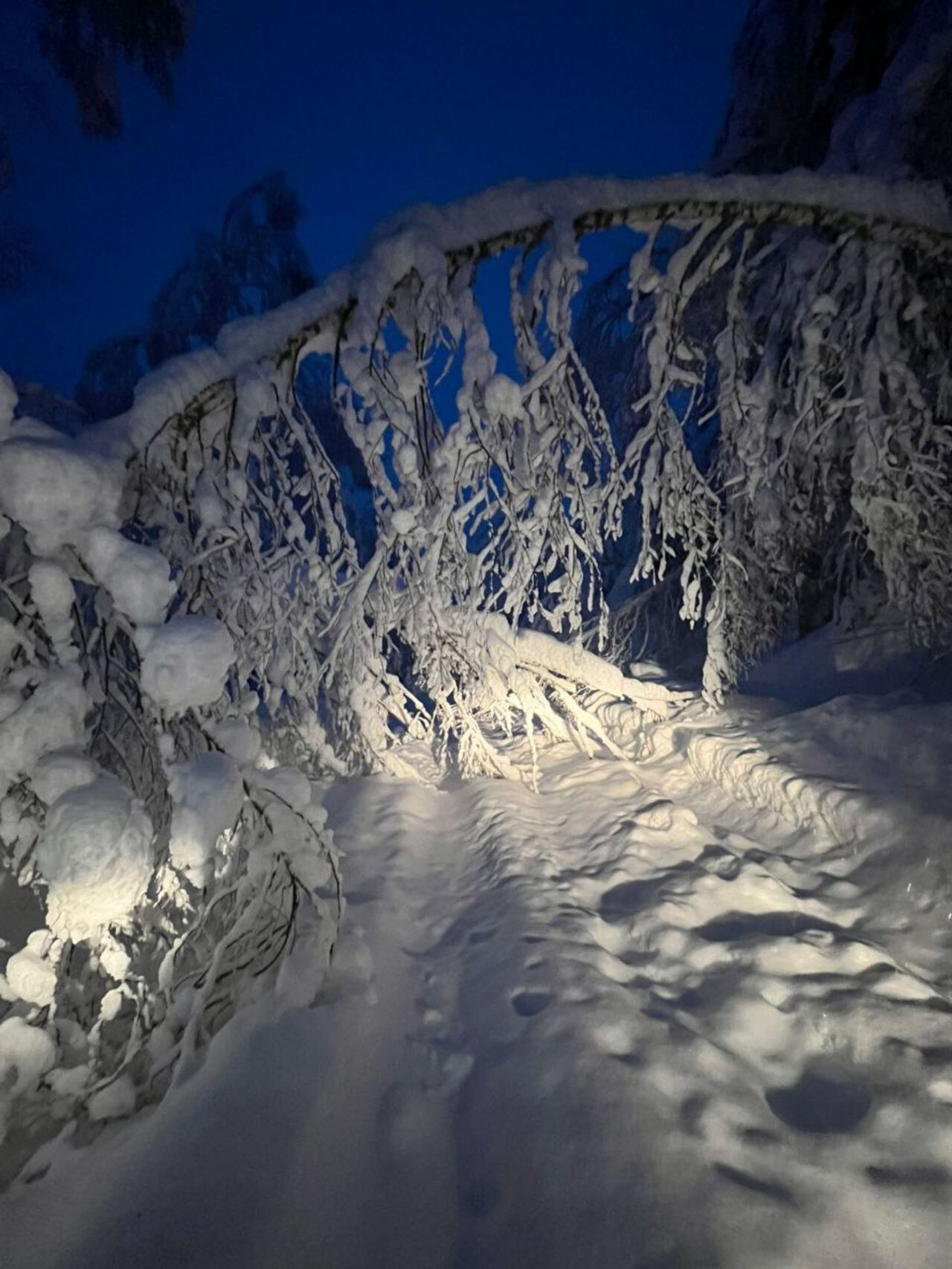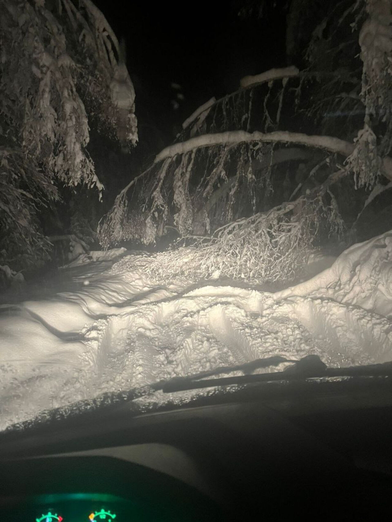 Судя по фотографиям, размещённым в соцсетях, дорога не только не очищена, но и заблокирована упавшими деревьями.