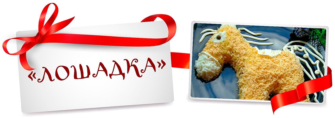 - На большую плоскую тарелку выкладываем мясо и лепим форму лошади. Сверху тонким слоем выкладываем лук, покрываем его майонезом. Далее посыпаем «лошадь» сыром, а затем – тертым желтком. Из тертого белка формируем копыта, морду, уши и седло. Глаз делаем из маслины. Рисуем майонезом на тарелке хвост и гриву.