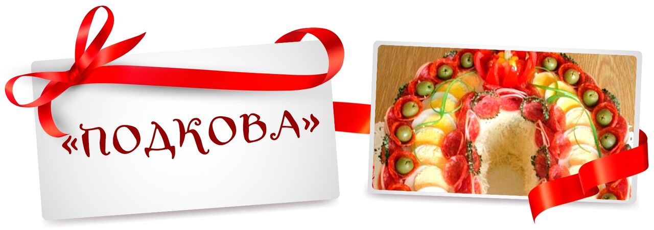 - Яйца режем поперек и укладываем на центр подковы. Режем колбасу, укладываем пластики в виде розочек по бокам салата. Колбасу нужно резать очень тоненько, чтобы она легко сворачивалась. Если колбаса не держит формы розочки, то можно скрепить зубочистками, но перед употреблением салата нужно предупредить гостей о наличии в колбасе зубочисток J
