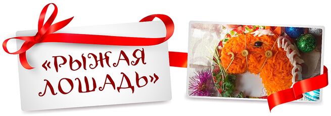 - Берем плоскую большую тарелку и аккуратно выкладываем голову лошади. Натираем на терке морковь, высыпаем ее поверх «лошадиной головы» и аккуратно распределяем по форме. Из двух треугольных кусочков моркови делаем ушки.