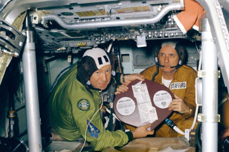 Cоветский командир Алексей Леонов (слева) и американский командир Томас Стаффорд в космосе, 1975 год.