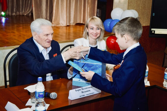 Борис Валентинович Волынов, единственный ныне живущий космонавт из первого отряда космонавтов СССР, общается со школьником