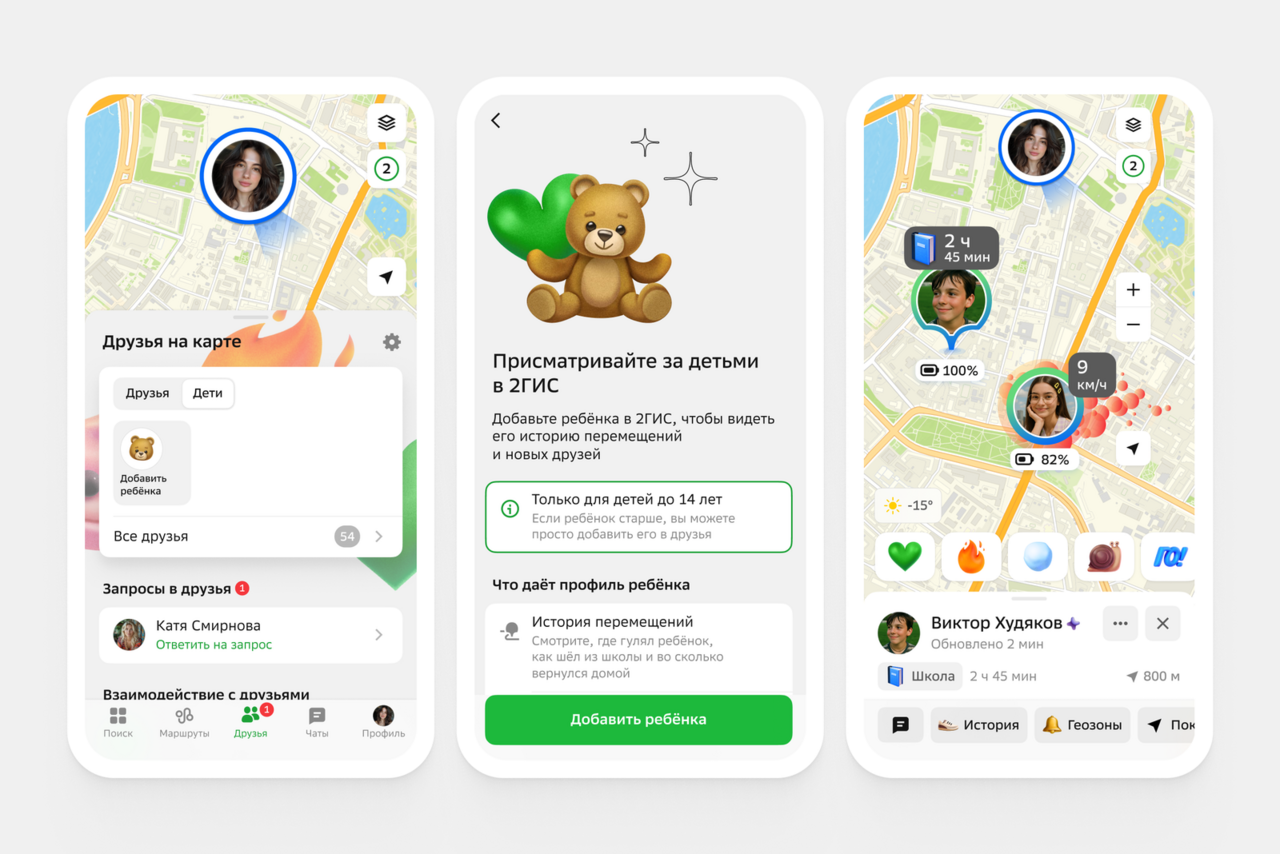 Функция "Друзья на карте" появилась в 2ГИС в 2023 году. Она позволяет делиться своей локацией с близкими, видеть, где кто находится, куда движется, обмениваться эмодзи или общаться в чатах – личных или групповых. Детский профиль стал логичным продолжением – теперь семья может быть на связи, не перебивая день сообщениями "где ты?".