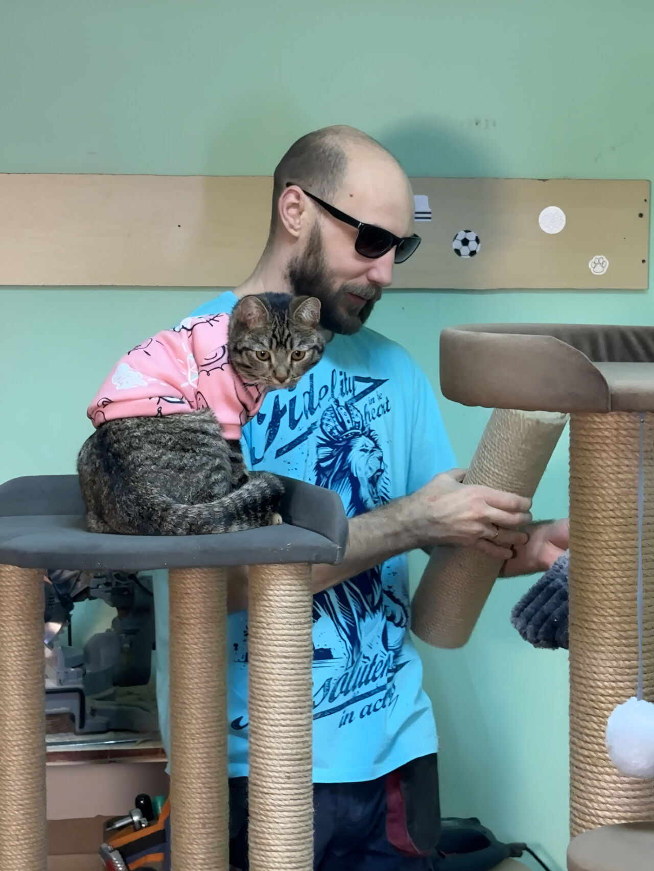 Кемеровчанин Андрей Хромин полностью лишился зрения из-за диабета. Сейчас перед его глазами – темный или светлый туман, в зависимости от времени суток. В 28 лет он заново начал учиться самым обыденным вещам, вплоть до приготовления еды. Молодой человек взял себя в руки и настроился на творческий процесс – делать домики для кошек.