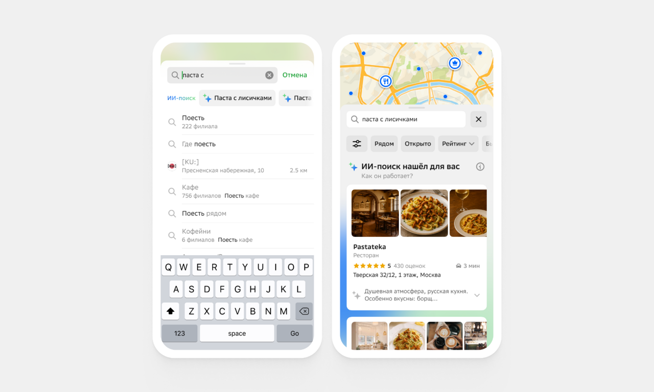 ИИ-поиск анализирует не только названия и специализацию кафе и ресторанов, но и отзывы, меню, фотографии и сайты – и показывает места, которые действительно подходят под запрос пользователя. А ещё сервис показывает короткие описания заведений, созданные ИИ на основе отзывов. Это экономит время и помогает быстрее выбрать, куда пойти.