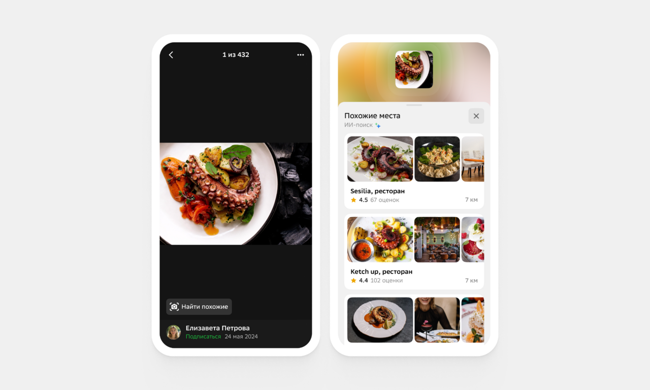 2ГИС стал первым в России геосервисом с визуальным поиском, который умеет находить заведения не по запросам, а по фотографиям – по фото можно найти то, что сложно объяснить словами. Пользователи могут выбирать места с похожим интерьером или блюдом, ориентируясь на понравившиеся изображения. Например, увидели кофейню с панорамными окнами или десерт, который хочется попробовать – достаточно нажать "Найти похожие" на фото в карточке ресторана, и 2ГИС подберёт заведения с похожей атмосферой или блюдами.