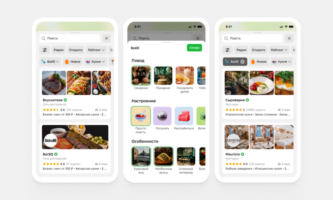 В категории "Поесть" появился новый фильтр – "Вайб". Он помогает выбрать заведение не по типу кухни и оценкам, а по настроению, особенностям и цели визита – на основе данных карточек компаний, проанализированных искусственным интеллектом. Аналогичных алгоритмов пока нет ни в одном из российских картографических сервисов. Можно найти заведения по: