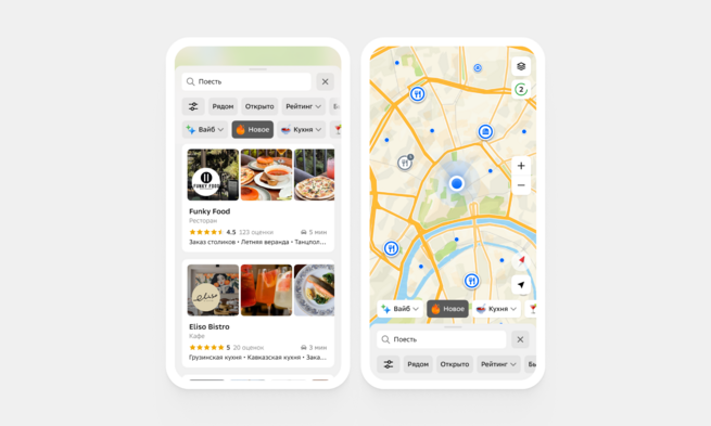 Такой поиск расширяет возможности выбора заведений и особенно подойдёт тем пользователям, кто не любит писать текстовые запросы.