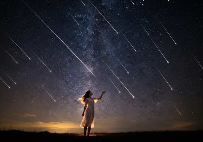 - Когда найдёте созвездие, не фиксируйтесь только на нём – метеоры появляются по всему небосводу. Направьте взгляд примерно на 40–50 градусов выше горизонта – туда, где небо достаточно тёмное и свободное от светового загрязнения у горизонта. При этом периферийное зрение охватывает большую часть неба. Именно периферийным зрением чаще всего замечают первые вспышки метеоров.