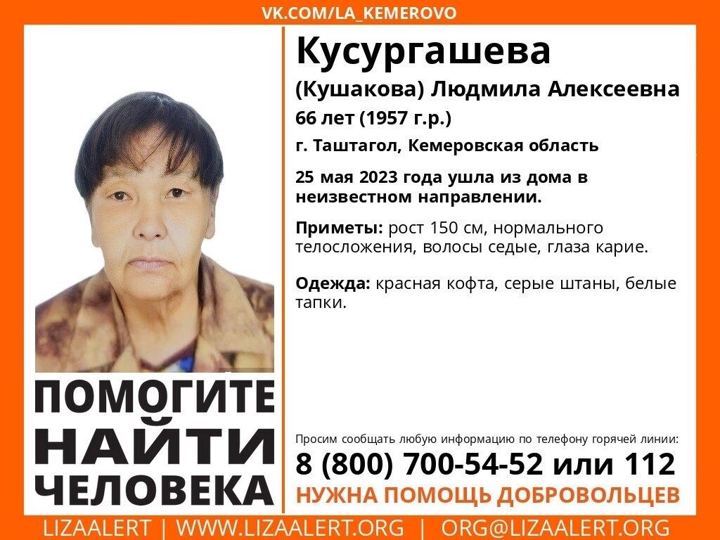 Волонтеры поисково—спасательного отряда "Лиза Алерт" в Кемеровской области сообщили, что в городе Таштаголе без вести пропала 66—летняя женщина. Кусургашева (Кушакова) Людмила Алексеевна ушла из дома 25 мая.