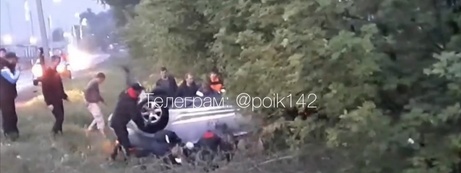 На кадрах также заметно, что рядом с местом аварии собралось множество людей. Некоторые из них пытались перевернуть автомобиль, а также вытащили из салона транспортного средства человека. О его состоянии на данный момент не сообщается.