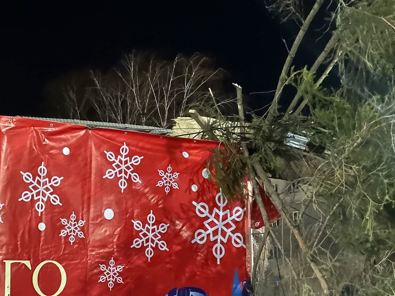Кроме того, на Центральной площади города порывом ветра сломало ствол ели. В результате дерево пришлось распилить и вывезти.