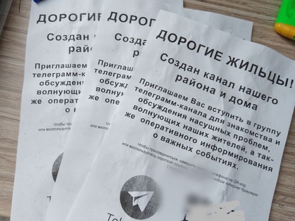 В чате главы Новокузнецка местные жители поделились информацией о том, что у подъездов домов в городе появились листовки с призывами вступить в telegram-канал района и дома.