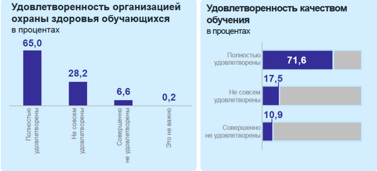 Полностью удовлетворены качеством обучения 71,6%, не совсем удовлетворены – 17,5%, вообще не удовлетворены – 10,9%.