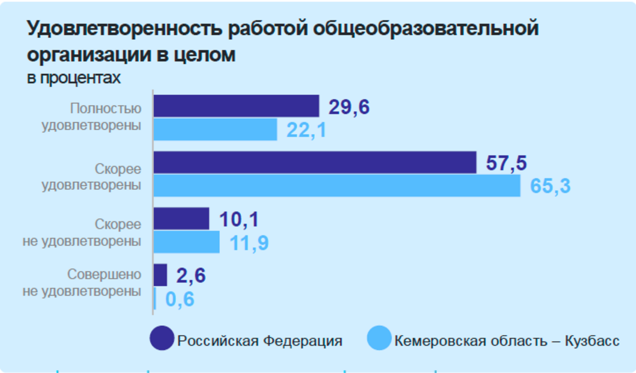 В Кузбассе полностью довольны работой школ в целом 22,1% жителей, в то время как по всей РФ этот показатель составил 29,6%. Такие данные публикует Кемеровостат.