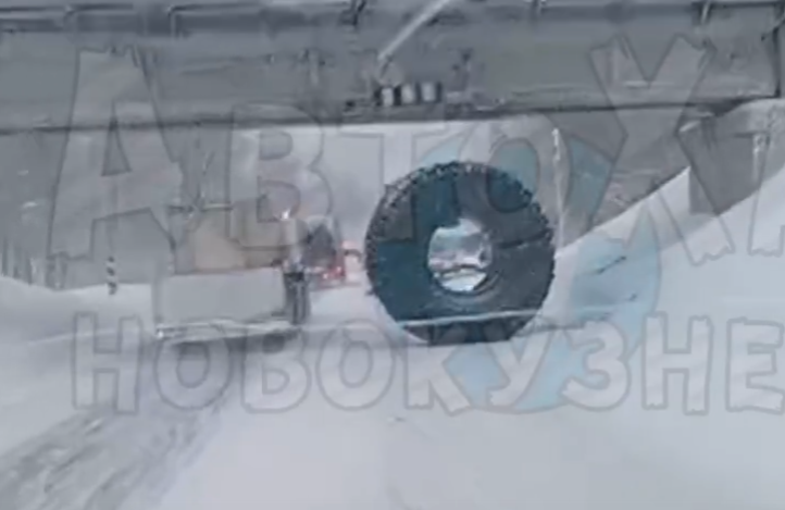 В Кузбассе на трассе между Новокузнецком и Мысками произошло ЧП с грузовиком, перевозившим шины от БелАЗов. Водитель не рассчитал габариты своего груза и, проезжая под виадуком, потерял одну из шин.