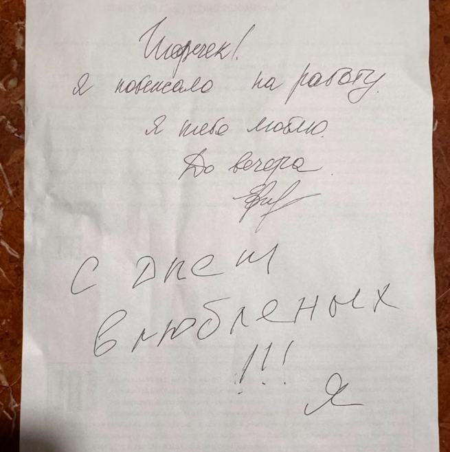 Так, в записке было сказано: "Игоречек! Я побежало на работу. Я тебя люблю. До вечера. С днем влюбленых" (орфография сохранена – прим. ред.).