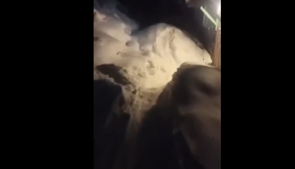 Людям приходится идти по узкой протоптанной дорожке, по бокам от которой высятся огромные сугробы.