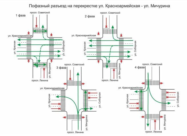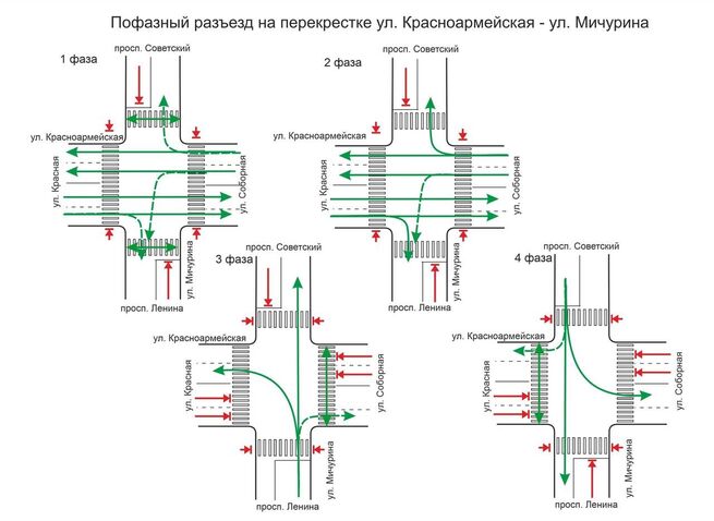 - 3 фаза – движение транспорта по ул. Мичурина от пр. Ленина, движение пешеходов через ул. Красноармейскую со стороны ул. Соборной.