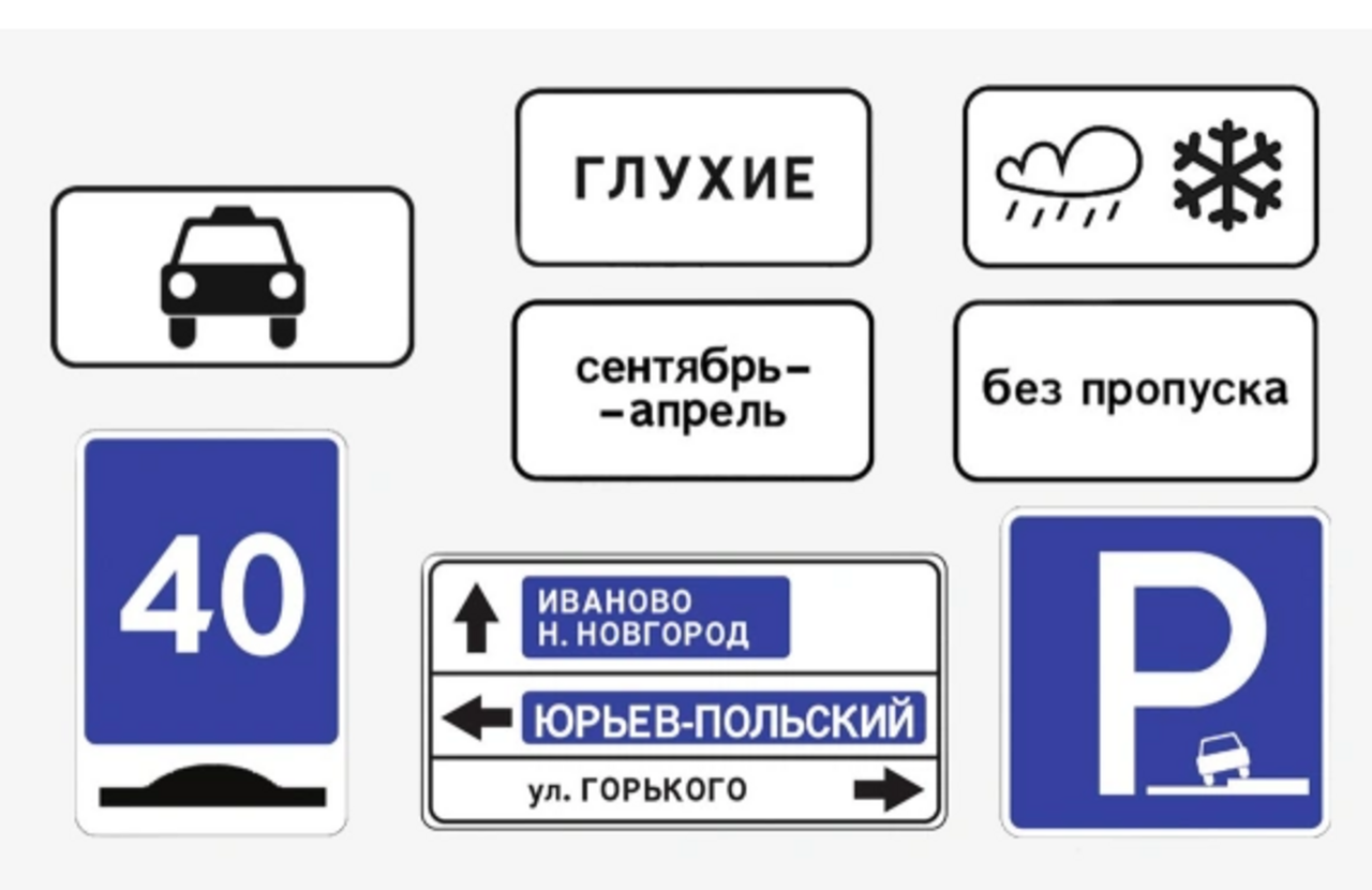 На опубликованных Росстандартом рисунках видно, что появится табличка, информирующая водителей о слабослышащих пешеходах – "Глухие". Появилась вертикальная версия "Стоп-линии" и знак, сообщающий о времени действия других обозначений по месяцам. Кроме того, сразу несколько знаков могут быть объединены в одной табличке.