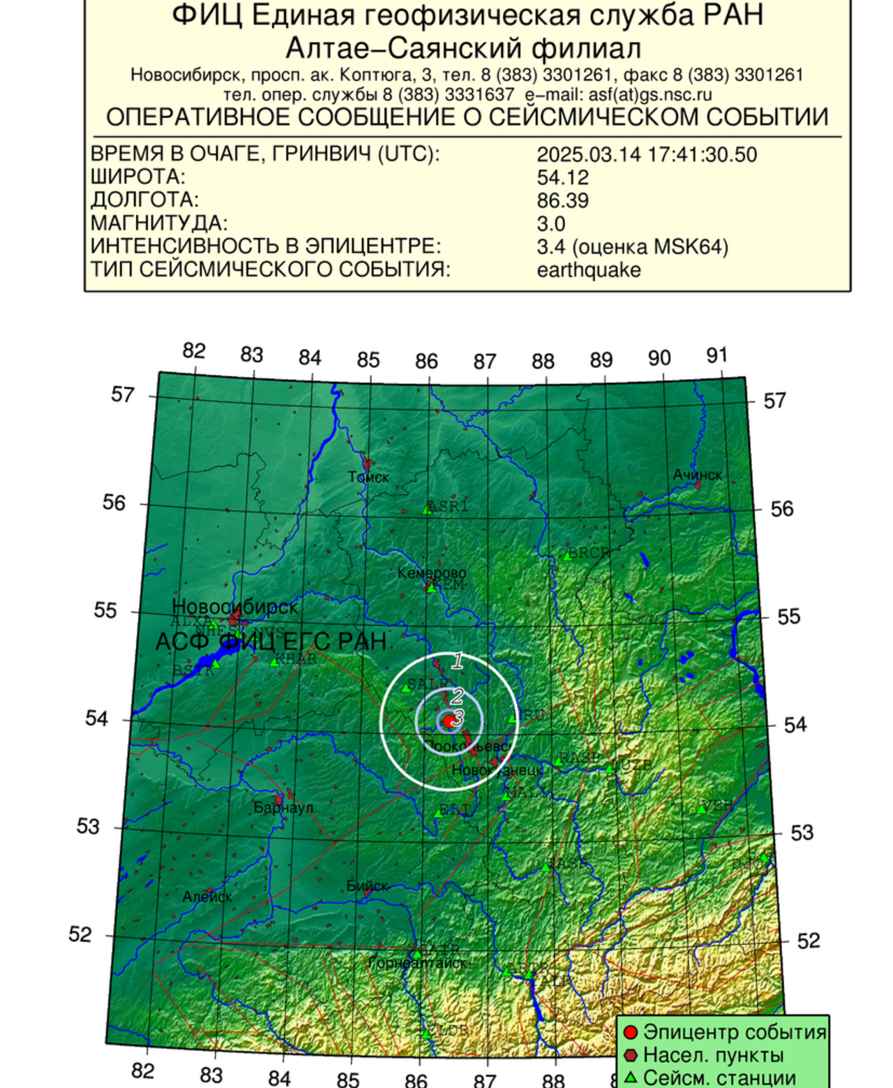 Как следует из данных сводки Алтае-Саянского филиала ФИЦ "Единая геофизическая служба РАН", магнитуда землетрясения составила 3,0, а интенсивность в эпицентре – 3,4 по шкале MSK64.