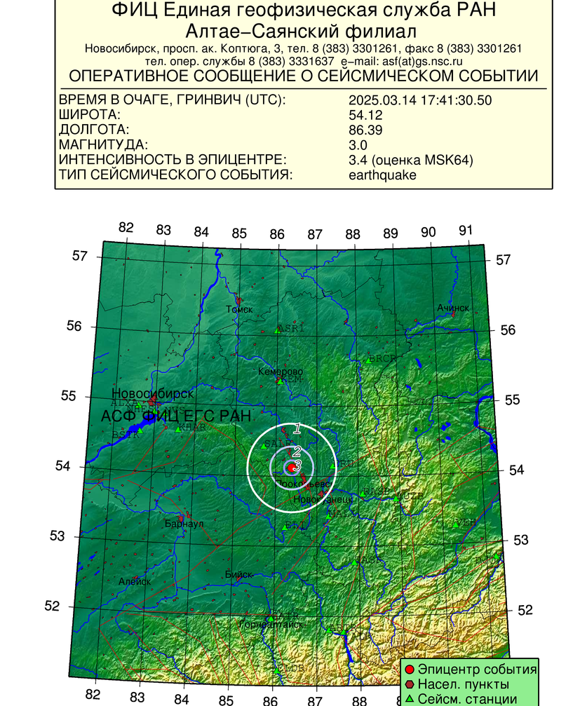 В ночь на 15 марта в Прокопьевском округе сейсмологи зафиксировали землетрясение. Оно произошло в 00:41 по местному времени.