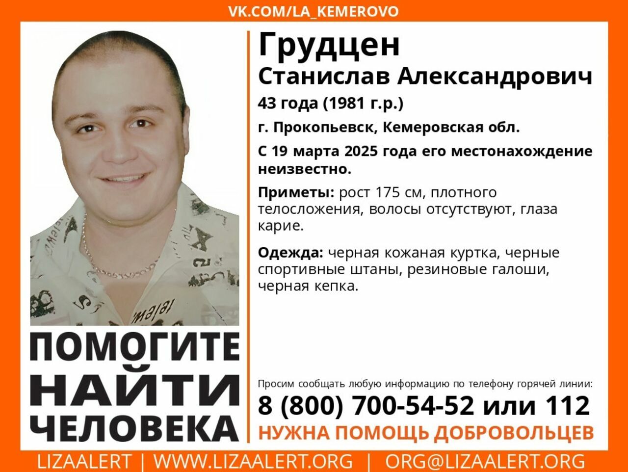 Как сообщили волонтеры ПСО "ЛизаАлерт", в Прокопьевске без вести пропал 43-летний Грудцен Станислав Александрович. Местонахождение мужчины остается неизвестным с 19 марта.