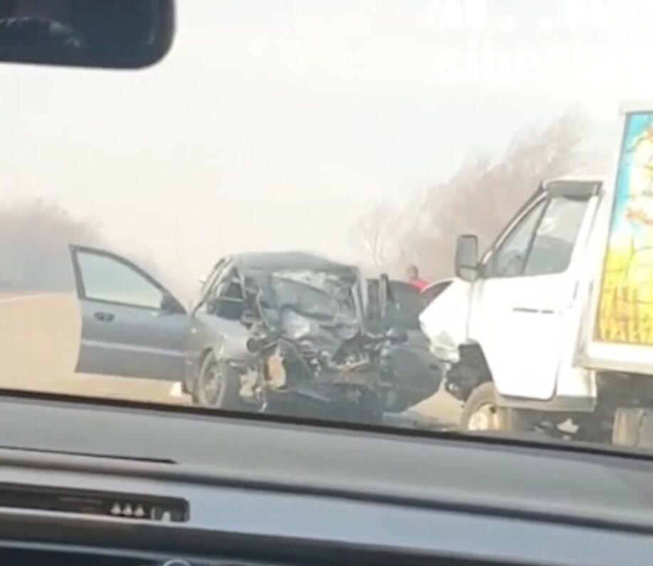 Под Саяногорском в Хакасии на трассе лоб в лоб столкнулись легковой автомобиль и грузовик. На дороге сохраняется минимальная видимость из-за дыма от горящих полей, огонь с которых распространяется ураганным ветром. Очевидцы делятся кадрами с места происшествия в социальных сетях.