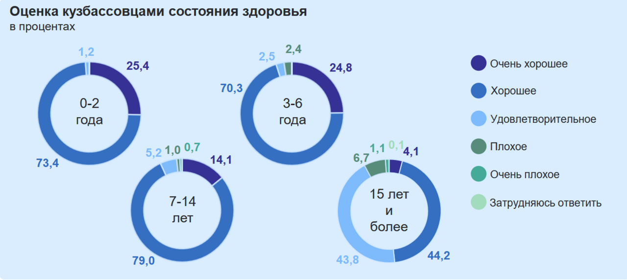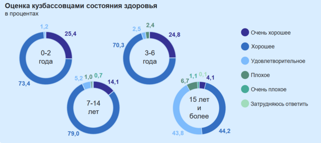 Также указывается, что 48,3% кузбассовцев оценивают свое здоровье как хорошее или очень хорошее. В целом по России – 52,7%. Плохо и очень плохо – 7,8% кузбассовцев.