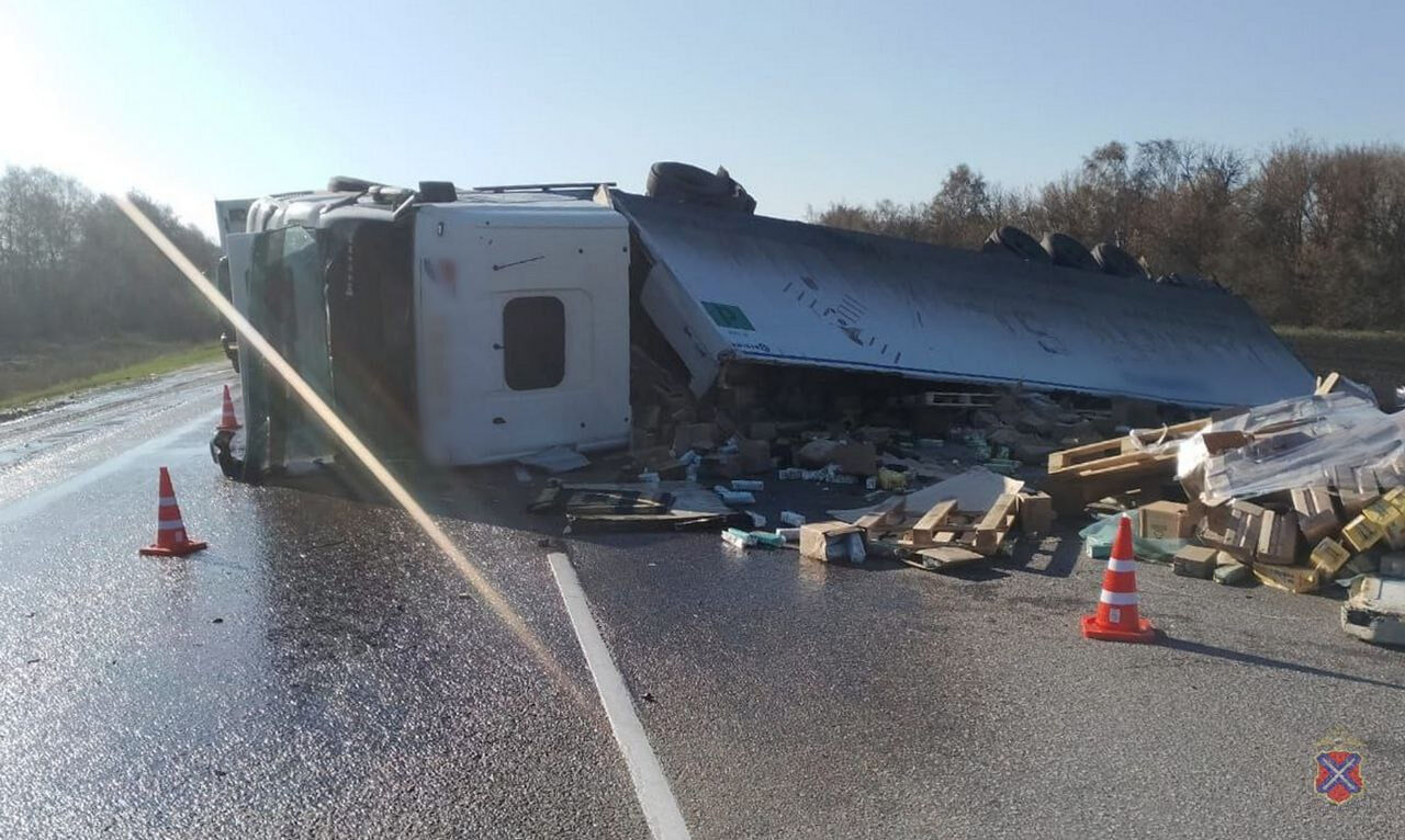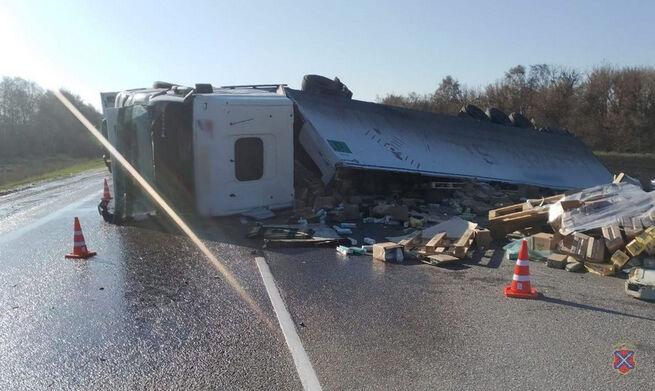 Многотонная машина опрокинулась на дороге в Волгоградской области. Водитель с травмами попал в больницу.