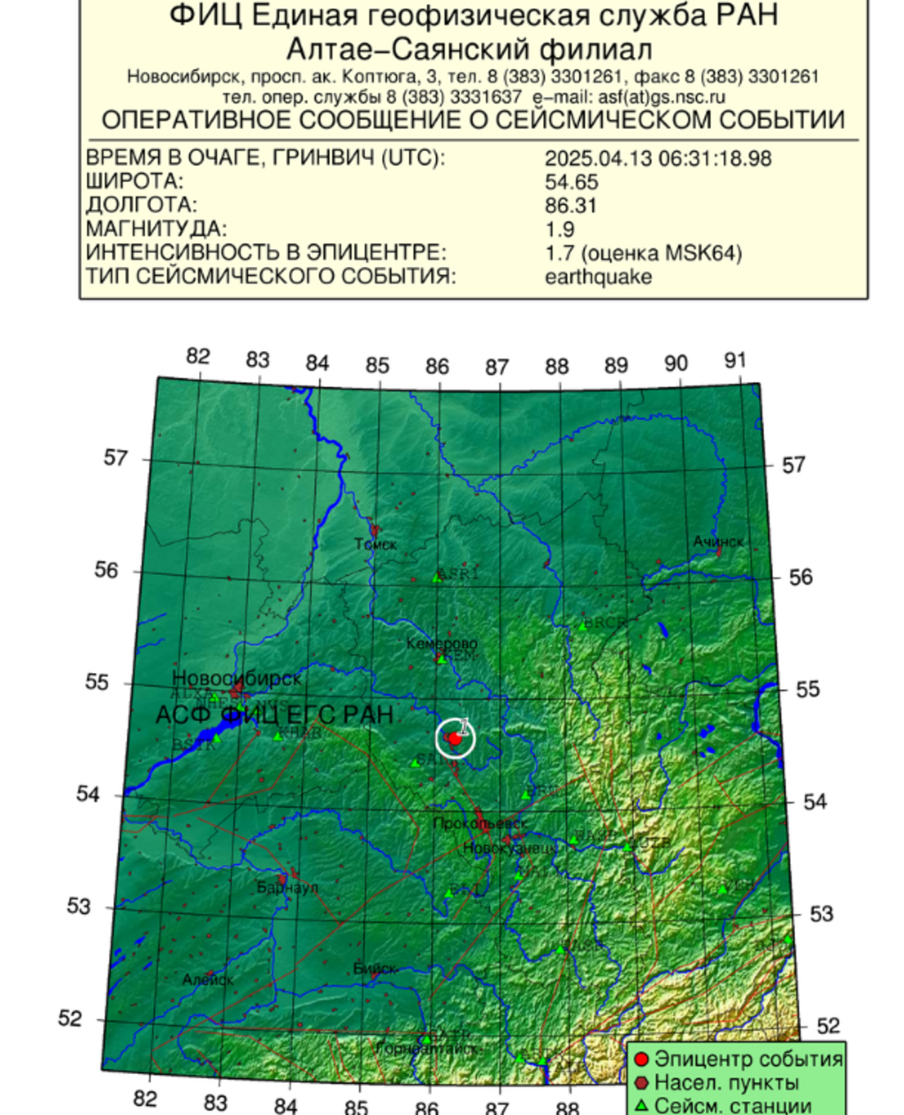 Сейсмологи зафиксировали подземные толчки в Кузбассе. Они произошли на территории Ленинск-Кузнецкого муниципального округа. Это следует из данных Алтае-Саянского филиала геофизической службы РАН.