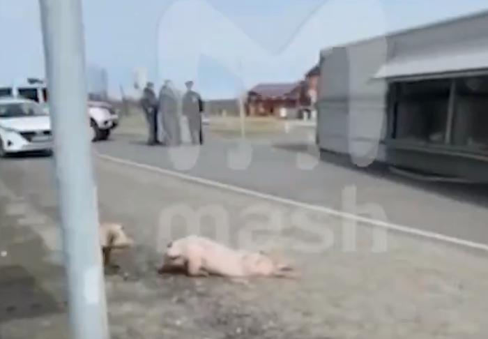 В ее кузове находилось несколько десятков живых свиней. Часть животных разбежалась по селу, минимум 30 пострадали. Отмечается, что у большинства свиней сломаны задние лапы – на опубликованных кадрах видно, как животное лежит на животе на обочине.