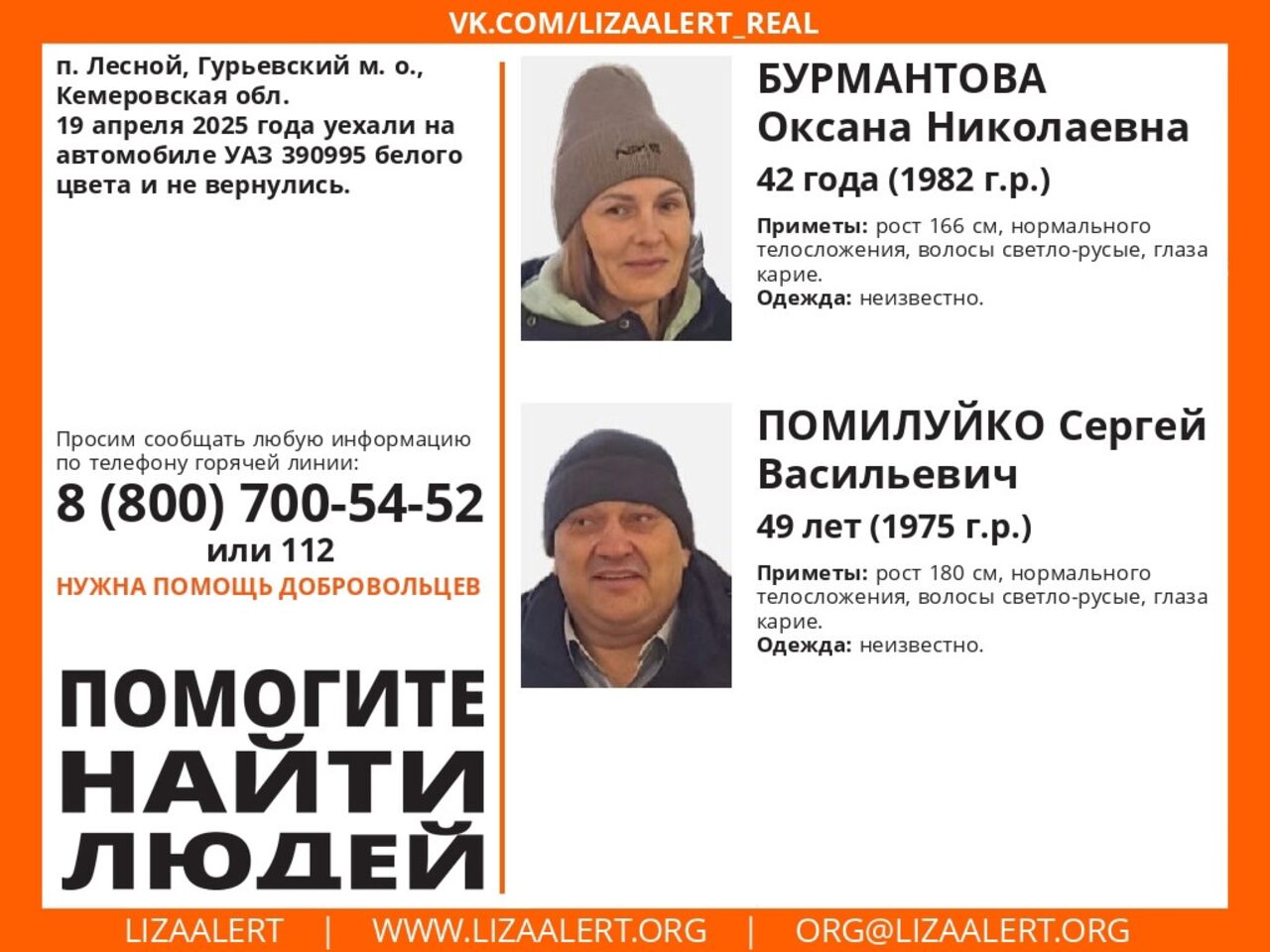 Как рассказали волонтеры ПСО "ЛизаАлерт", в поселке Лесной, Гурьевский муниципальный округ, без вести пропали 42-летняя Бурмантова Оксана Николаевна и 49-летний Помилуйко Сергей Васильевич. Сообщается, что накануне, 19 апреля, они уехали на автомобиле УАЗ-390995 белого цвета, но назад так и не вернулись.