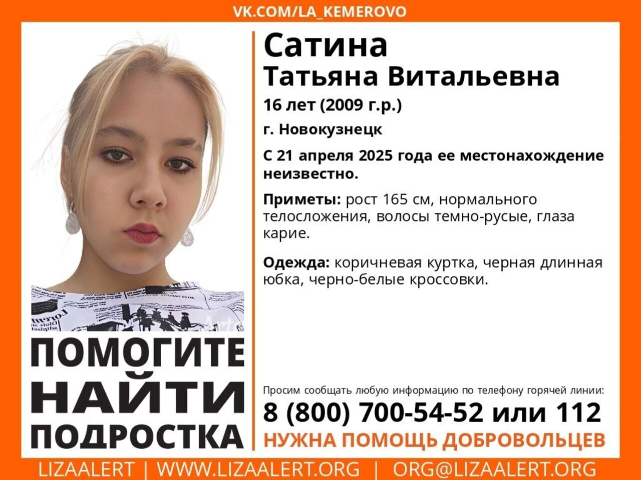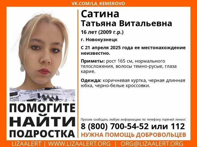 В Новокузнецке пропала 16-летняя Сатина Татьяна Витальевна. Как сообщили волонтеры ПСО "ЛизаАлерт", местонахождение девочки остается неизвестным с 21 апреля.