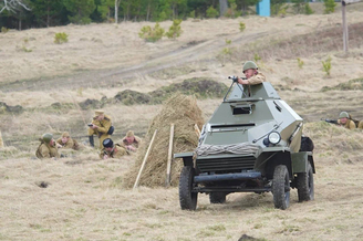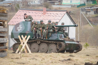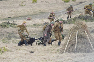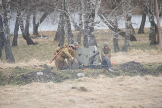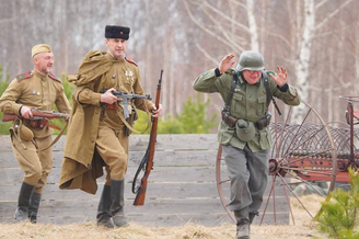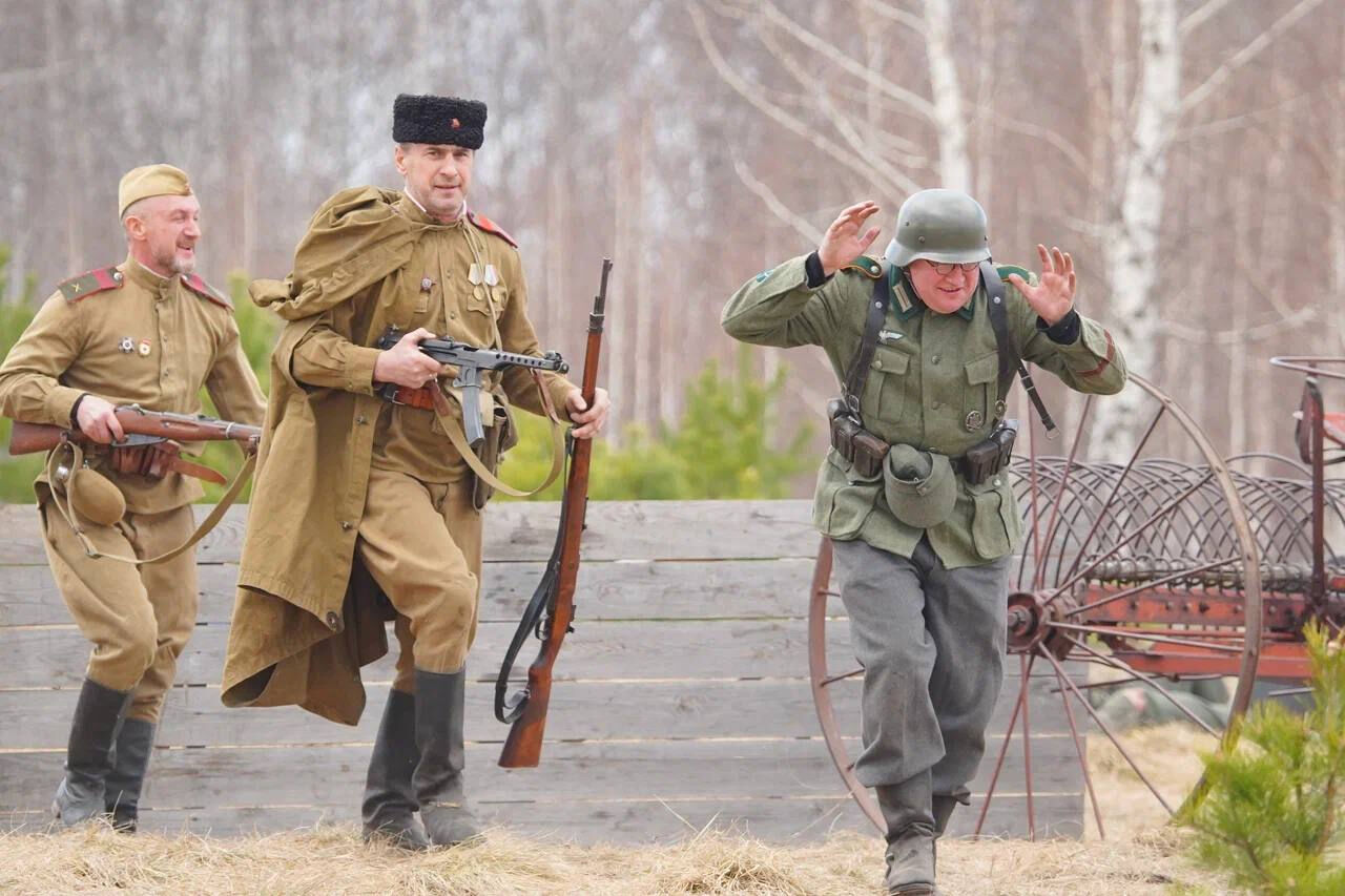 Переодетые с форму РККА и Вермахта историки устроили показательный "бой" с применением военной техники тех лет, пиротехники и не только. В конце "советские бойцы" триумфально взяли в плен разгромленных "немцев".