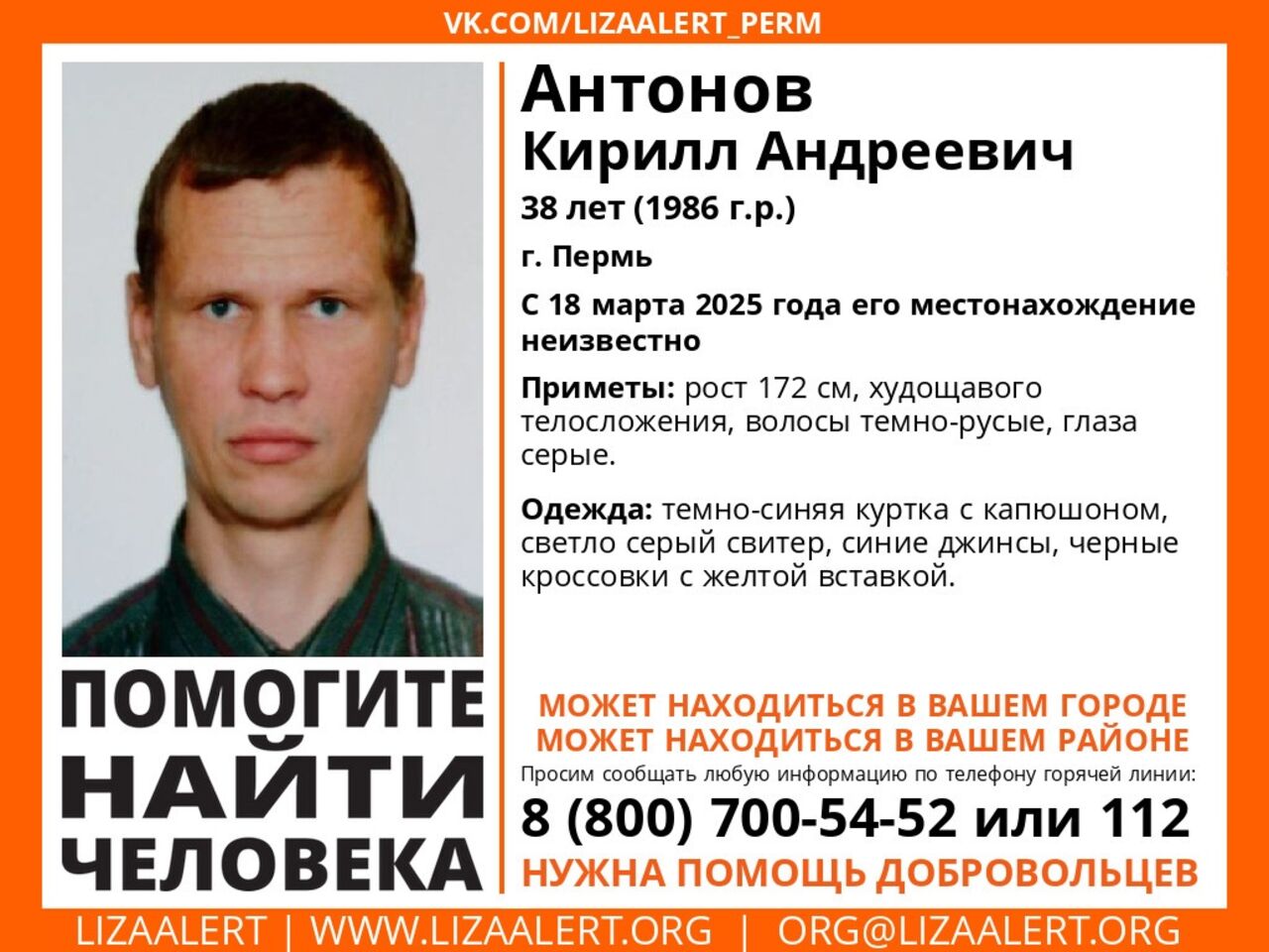 В Перми пропал 38-летний Антонов Кирилл Андреевич. Местонахождение мужчины остается неизвестным с 18 марта.