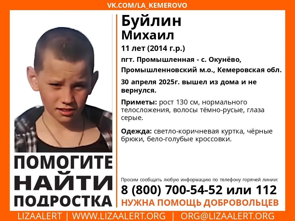 ПСО "ЛизаАлерт" объявил о старте поисков 11-летнего жителя Промышленновского муниципального округа. Буйлин Михаил вышел из дома накануне, 30 апреля, но обратно так и не вернулся. Мальчик может находиться в пгт Промышленная или в селе Окунево.
