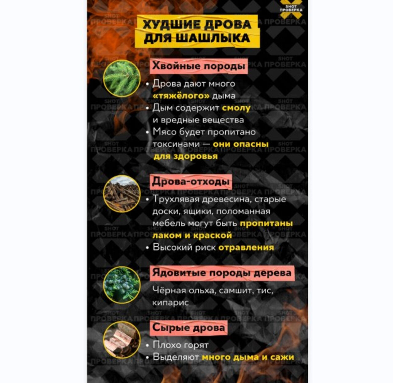 И это далеко не самое страшное: есть породы деревьев, которые могут привести к отравлению. Например хвойные деревья, содержащие в себе смолу, пропитывают мясо опасными токсинами. Также не стоит разводить огонь с помощью кипариса, самшита, тиса и черной ольхи.