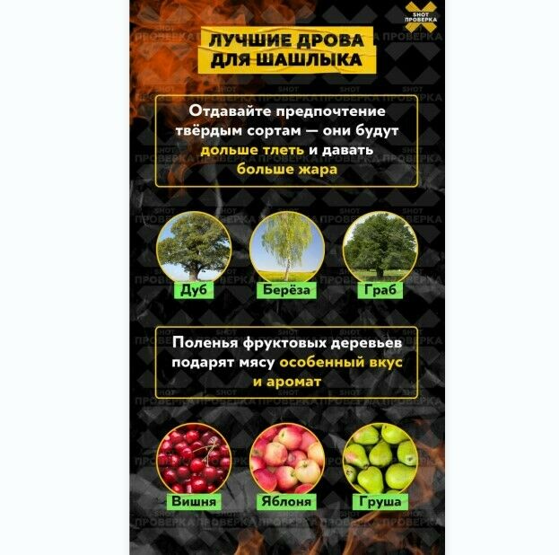 Лучше всего использовать дрова из граба, дуба или березы – они дольше тлеют и дают больше жара. Для вкуса и аромата можно использовать грушу, вишню или яблоню. Информацией делится Telegram-канал SHOT ПРОВЕРКА.