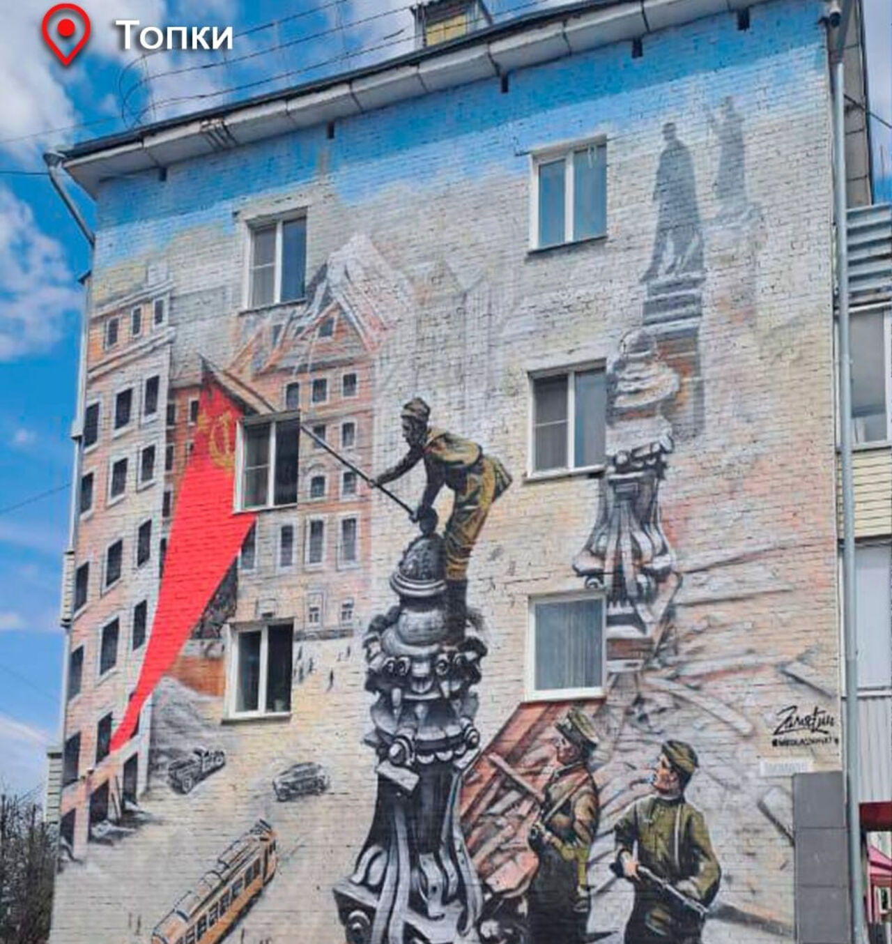 Также в Топках мурал, посвященный 80-летию Победы, был создан на входе на Комсомольскую площадь. На доме появилось изображение момента водружения знамени Победы на поверженный рейхстаг.