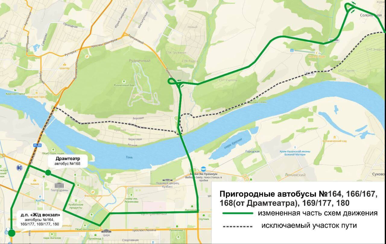Пригородные маршруты № 164 "Ж/д вокзал – с. Силино", № 166/167 "Ж.д. Вокзал – д. Упоровка", № 169/177 "Ж.д. Вокзал – д. Тебеньки" и № 180 "Ж/д вокзал – д/о Шахтер" от железнодорожного вокзала проследуют по проспектам Кузнецкому и Советскому, улицам 50 лет Октября и Красноармейской, через Красноармейский мост, по улице Соборной, проспекту Октябрьскому, улице Терешковой, Кузбасскому мосту, Леснополянскому шоссе, Журавлевым горам, Елыкаевской трассе, а затем продолжат движение по своим стандартным схемам в обоих направлениях.