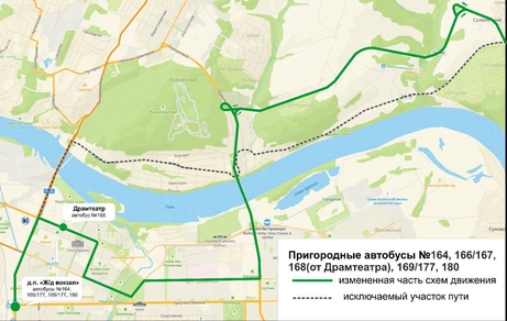 Маршрут № 168 "Драмтеатр – с.о. Журавли" будет следовать от Драмтеатра по проспекту Советскому, улицам 50 лет Октября и Красноармейской, через Красноармейский мост, по улице Соборной, проспекту Октябрьскому, улице Терешковой, Кузбасскому мосту, Леснополянскому шоссе, Журавлевым горам, Елыкаевской трассе, и далее по своему обычному маршруту в обоих направлениях.