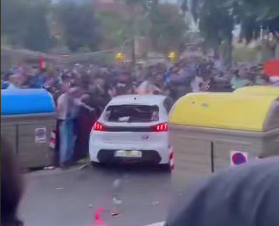 На снятом с места происшествии видео можно увидеть, как транспортное средство трогается с места после того, как люди начали забрасывать автомобиль различными предметами. Уточняется, что белый автомобиль марки Peugeot, не снижая скорости, устремился в толпу.