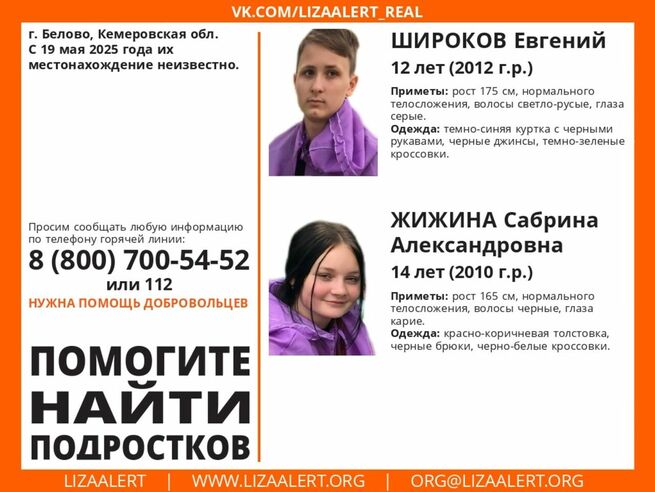 В Белове без вести пропали Сабрина Жижина ( 14 лет) и Евгений Широков (12 лет). По факту произошедшего возбуждено уголовное дело.