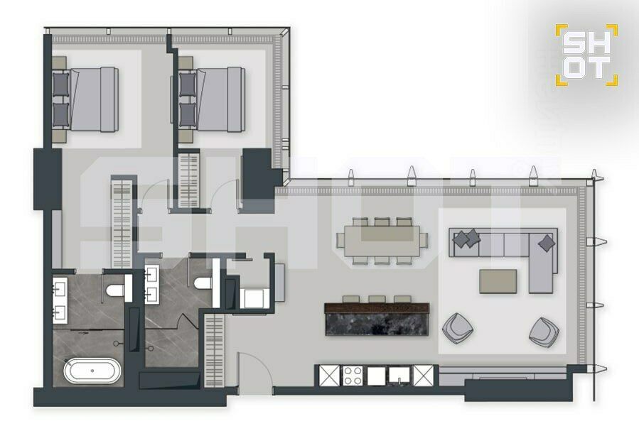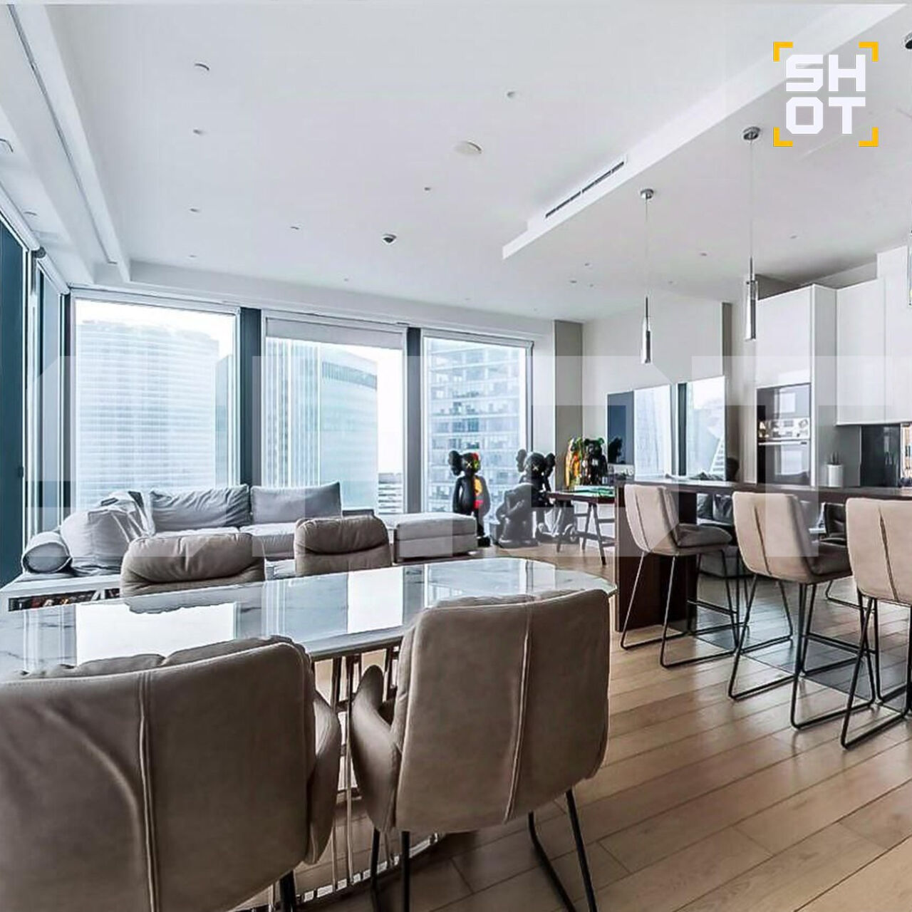 По предоставленной информации, в квартире, расположенной на 44-м этаже и имеющей площадь 124 квадратных метра, был проведен дизайнерский ремонт.