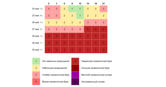 По имеющейся информации, это первое продолжительное магнитное возмущение такого масштаба в мае.