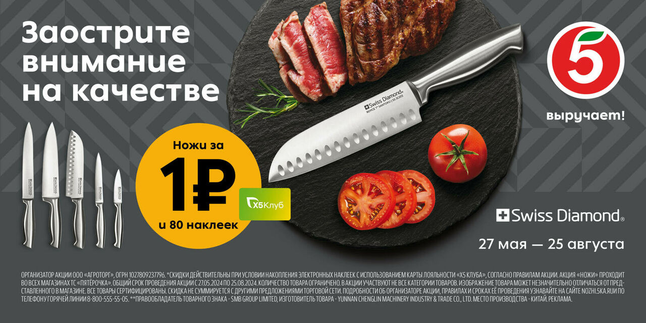 Торговая сеть "Пятёрочка" запустила акцию "Заострите внимание на качестве". Совершая ежедневные покупки в магазинах "у дома" с 27 мая по 25 августа, вы сможете, накопив наклейки, приобрести ножи Swiss Diamond от 1 рубля, произведенные под швейцарским контролем качества.