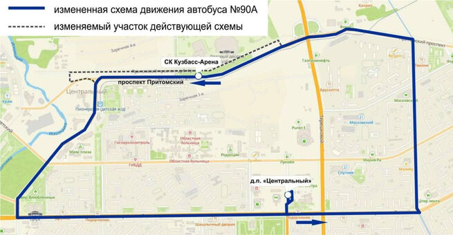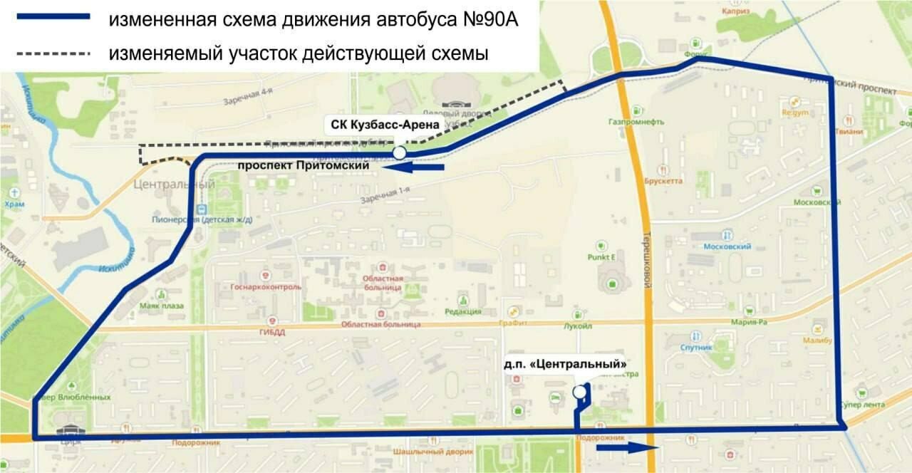 Автобус № 90А "Д/п Центральный – СК Кузбасс – Арена" с 9:00 до 16:00 будет двигаться по Притомскому проспекту вместо дублера.