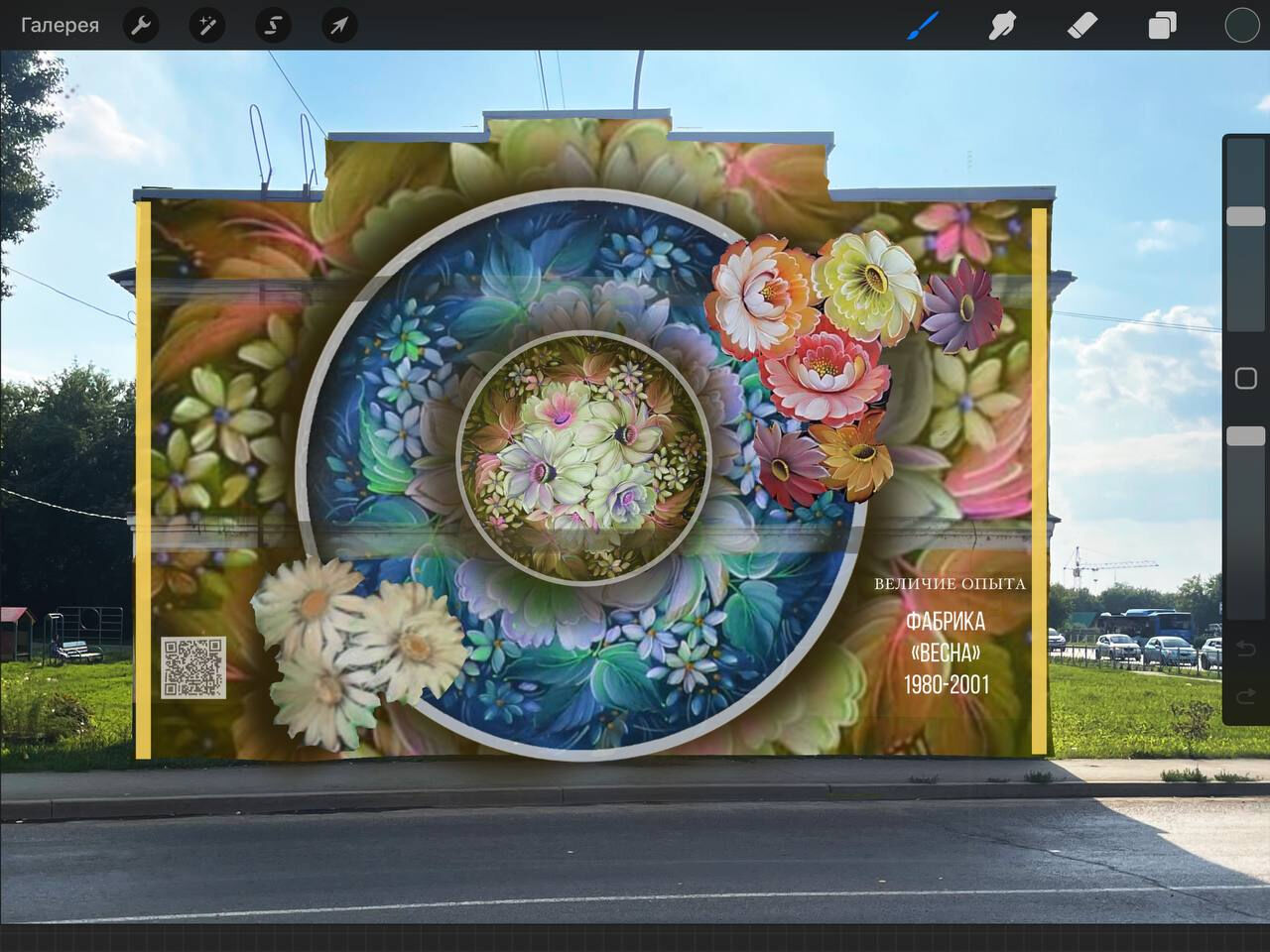 Второй мурал расскажет о фабрике "Весна" – месте, которое дарило людям красоту. Здесь рождалась "кемеровская роспись" на подносах, вазах, самоварах и другой посуде. Фишка росписи 一 двухцветный мазок, что придает рисунку неповторимый объем и фактуру.