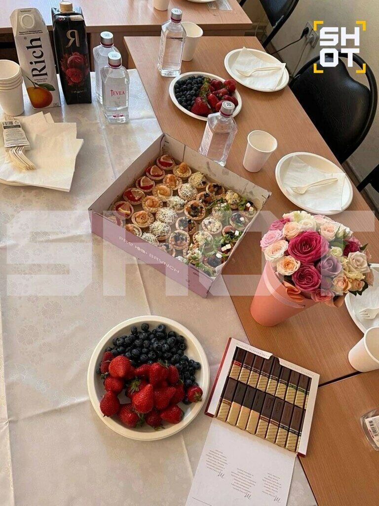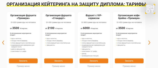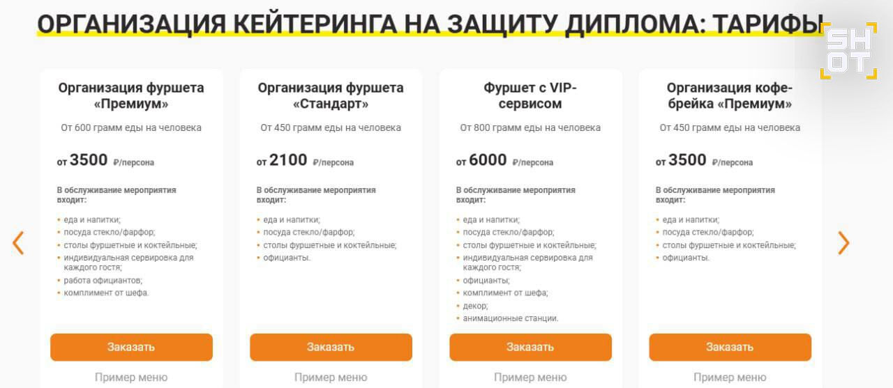 Telegram-канал SHOT также обратил внимание, что некоторые кейтеринговые компании начали предоставлять особые услуги специально для защиты диплома: в них, как видно на опубликованном скриншоте, входят не только различные блюда, но и официанты с аниматорами.